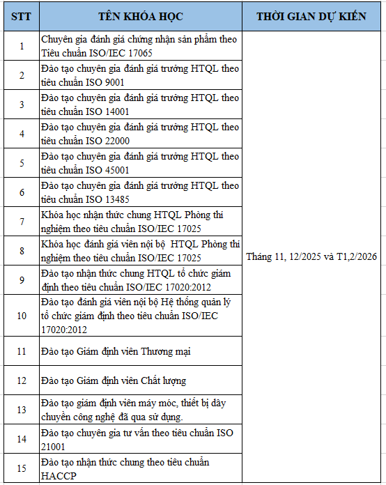 Trung tâm chứng nhận hợp chuẩn hợp có các khóa học năm 2025 và 2026